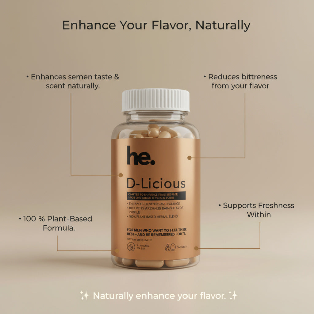 He. D-Licious is a plant-based dietary supplement specially formulated to naturally sweeten the taste and scent of semen while reducing bitterness and enhancing body freshness. Blended with sweet-tart 🌿 Pineapple, crisp Cranberry, maple-scented Fenugreek, warming Cinnamon Bark, and a hint of sensual Rose Petal, this powerful formula works harmoniously with your body to elevate your natural flavor profile.