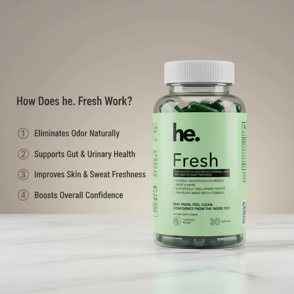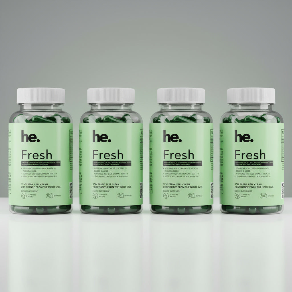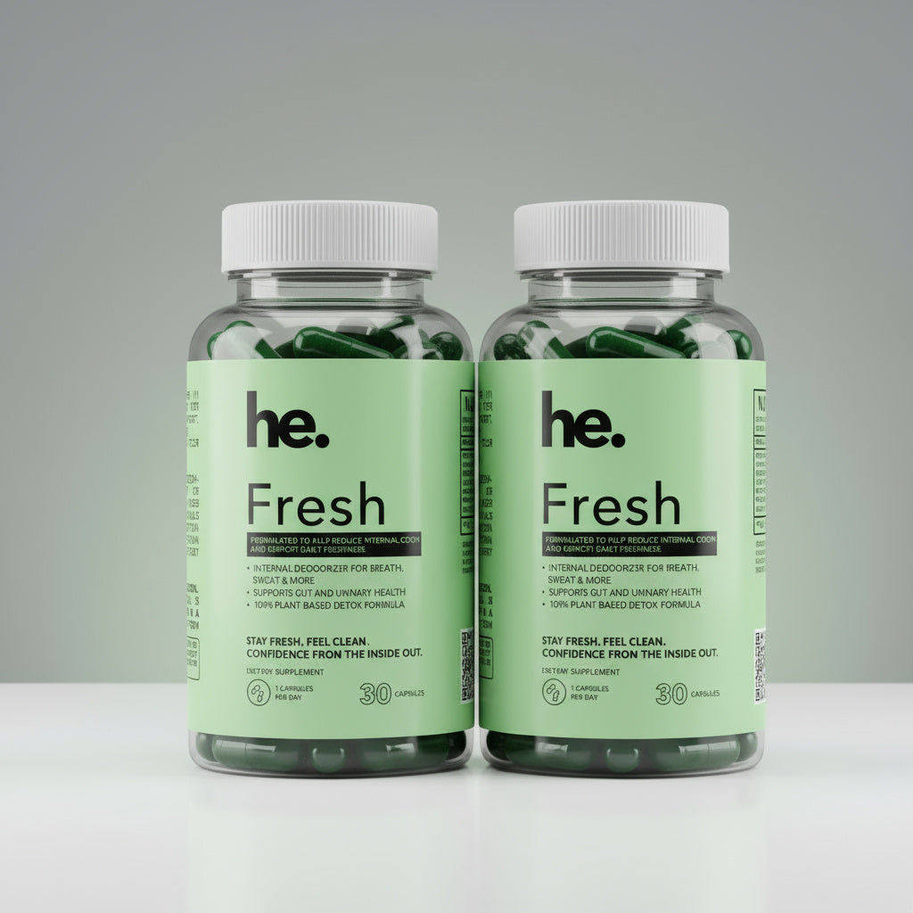 He. Fresh is a plant-based daily supplement designed to naturally neutralize unwanted body odors—from breath and sweat to intimate areas—while promoting gut balance and urinary health. Powered by chlorophyll-rich 🌿 Organic Parsley, cooling Peppermint, toxin-binding Activated Charcoal, and probiotic Lactobacillus, this formula works with your body to keep you feeling fresh, confident, and clean from the inside out.