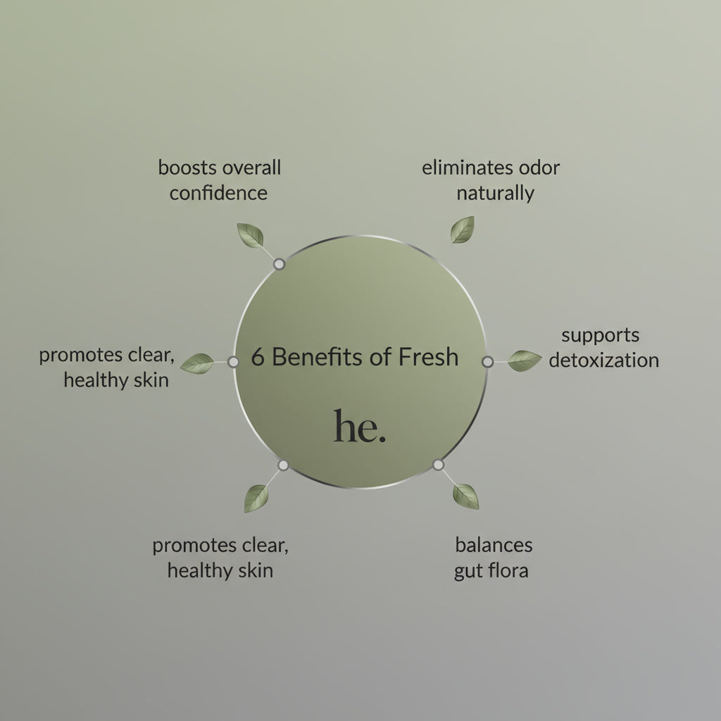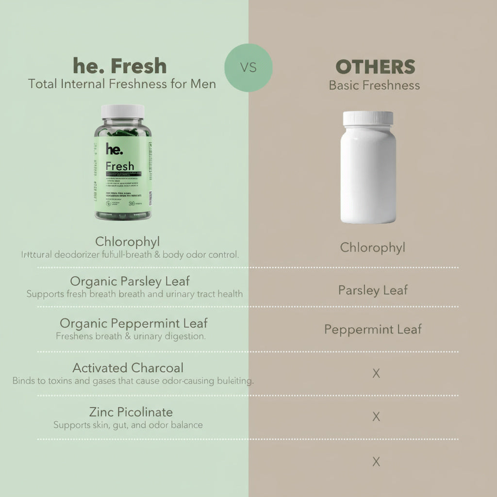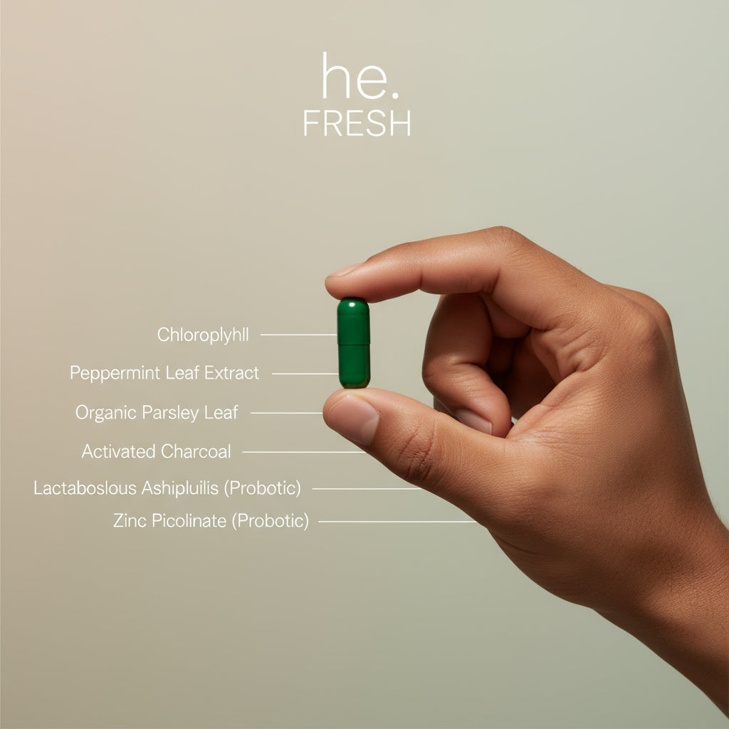 He. Fresh is a plant-based daily supplement designed to naturally neutralize unwanted body odors—from breath and sweat to intimate areas—while promoting gut balance and urinary health. Powered by chlorophyll-rich 🌿 Organic Parsley, cooling Peppermint, toxin-binding Activated Charcoal, and probiotic Lactobacillus, this formula works with your body to keep you feeling fresh, confident, and clean from the inside out.